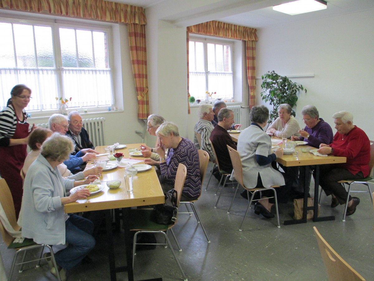Am 1. Oktober 2012 fand der erste Scherpenberger Mittagstisch im Saal unter der Kirche statt. Dies ist mittlerweile 10 Jahre her. Wer hätte gedacht, dass das Projekt Mittagstisch ein nachhaltiges Angebot wird und sich bis heute so großer Beliebtheit erfreut. Tagtäglich besuchen ca. 30 Personen den Mittagstisch, um in Gesellschaft zu essen, Kontakte zu knüpfen, den Tagesablauf zu strukturieren oder weil man für sich selbst allein nicht kochen würde. Im Laufe der Jahre wurden viele Freundschaften unter den Besuchenden geschlossen, man verabredete sich zum Besuch anderer Veranstaltungen des Begegnungszentrums und lernte die Vielfalt der Angebote kennen und schätzen.