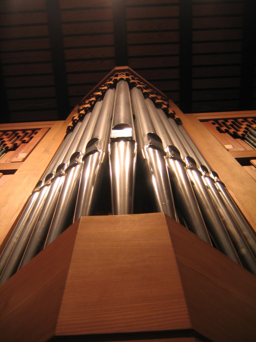 Wenn man unsere Kirche so von außen betrachtet wirkt sie doch eher schlicht und bescheiden. Das täuscht leicht darüber hinweg, dass sie in ihrem Inneren einen Schatz birgt, nämlich unsere Orgel. Erbaut wurde sie im Jahr 1985 von der Orgelbaufirma Hammer aus Hemmingen bei Hannover. Viele Gastorganisten haben sich schon lobend über die Farbigkeit und die vielen Möglichkeiten des Instrumentes geäußert. 18 Register (das sind die verschiedenen Klangfarben, die sich aus der unterschiedlichen Bauart der Pfeifen ergeben) verteilen sich auf 2 Manuale und Pedal, das ist für den kleinen Kirchenraum schon recht großzügig. 1004 Pfeifen aus Holz und Metall stehen im Orgelgehäuse, die Kleinsten haben Bleistiftgröße, die Größte erreicht eine Länge von 2,40 Metern. Wegen der fehlenden Höhe auf der Empore liegen die 5 größten Pedalpfeifen unter der Orgel auf dem Emporenboden.